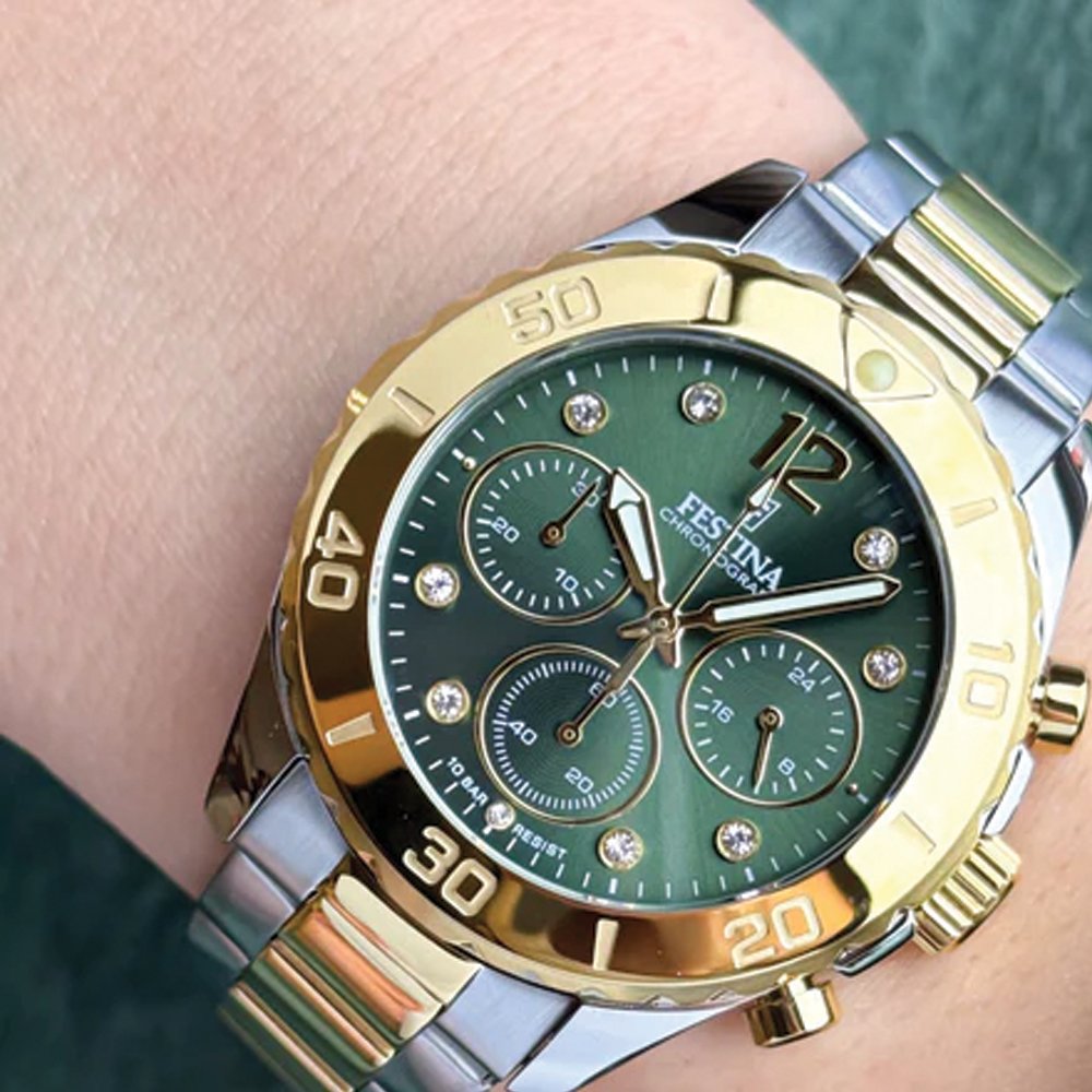 BOYFRIEND COLLECTION F20604/2Festina boyfriend collection for women, a feminine watch with a masculine singularity. This 39mm Chrono features a beautifully set cubic zirconia indice green dial, steel and yellow gold plated case and bracelet and has a mineral glass. Water resistant to 100 meters. Festina boyfriend watches for women bring an innovative and dynamic style offering unprecedented designs in the world of modern watchmaking.