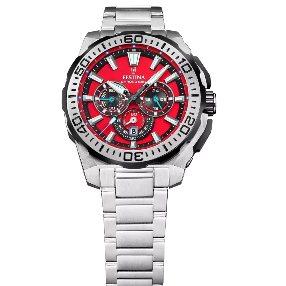 CHRONO BIKE F20724/5The Festina Chrono Bike 2025 is a chronograph designed for lovers of sport and precision. Its 45.5 mm 316L stainless steel case guarantees resistance to shocks, scratches and corrosion, while its MOS20 quartz movement offers precise and reliable time measurement. The vibrant red dial with luminescent indexes and hands allows for optimal readability even in low-light conditions. It also features three functional subdials and a date window at 6 o'clock.