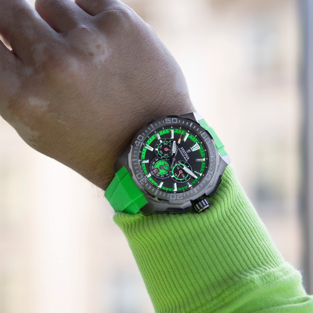 Shop now URL https://www.timewatches.co.za/products/festina-chrono-bike-quartz-chronograph-green-rubber-mens-watch-f20725-3
