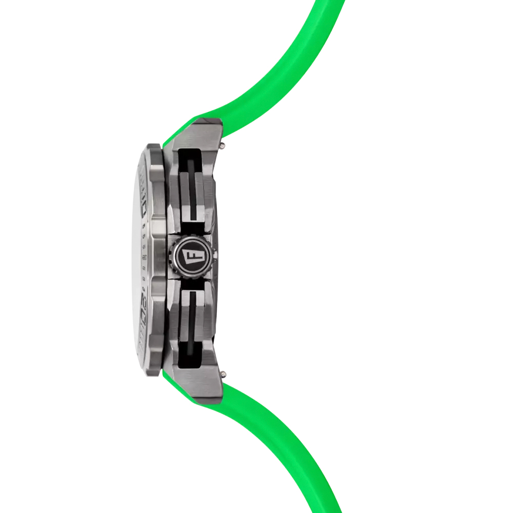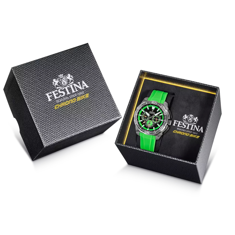 CHRONO BIKE F20725/3The Festina Chrono Bike 2025 combines performance and style in a sporty and robust design. Its 45.5 mm 316L stainless steel case ensures strength and durability, while its silicone strap offers a comfortable and flexible fit for any activity. Equipped with a MOS20 quartz movement, this chronograph enables accurate timekeeping and features a date window at 6 o'clock for added functionality. The green dial, with vibrant coloured details, applied indexes and luminescent hands, ensures optimal legibility in any light conditions.