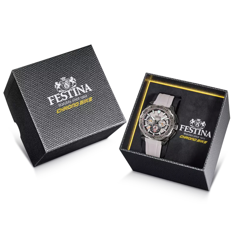 CHRONO BIKE F20726/1The Festina Chrono Bike 2025 is a sports watch that combines precision and endurance in a dynamic design. Its 45.5 mm 316L stainless steel case ensures durability and protection, while its silicone strap provides a comfortable and flexible fit. Equipped with a MOS20 quartz movement, this chronograph offers accurate timekeeping and includes a date window at 6 o'clock for added functionality. Its light brown dial, with vibrantly coloured details, applied indexes and luminescent hands, ensures optimal readability in any lighting conditions.