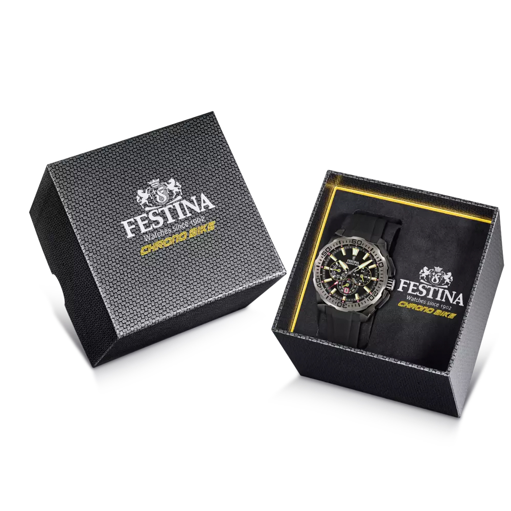 CHRONO BIKE F20726/3The Festina Chrono Bike 2025 is a sports watch that combines precision and endurance in a dynamic design. Its 45.5 mm 316L stainless steel case ensures durability and protection, while its silicone strap provides a comfortable and flexible fit. Equipped with a MOS20 quartz movement, this chronograph offers accurate timekeeping and includes a date window at 6 o'clock for added functionality. Its black dial, with vibrantly coloured details, applied indexes and luminescent hands, ensures optimal readability in any lighting conditions.