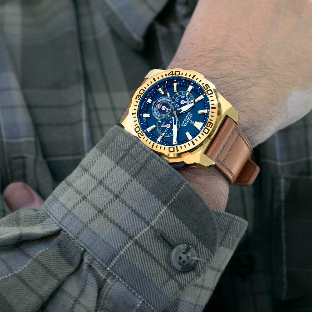 Dial Blue Chronograph with yellow accents with luminescent indices and hands