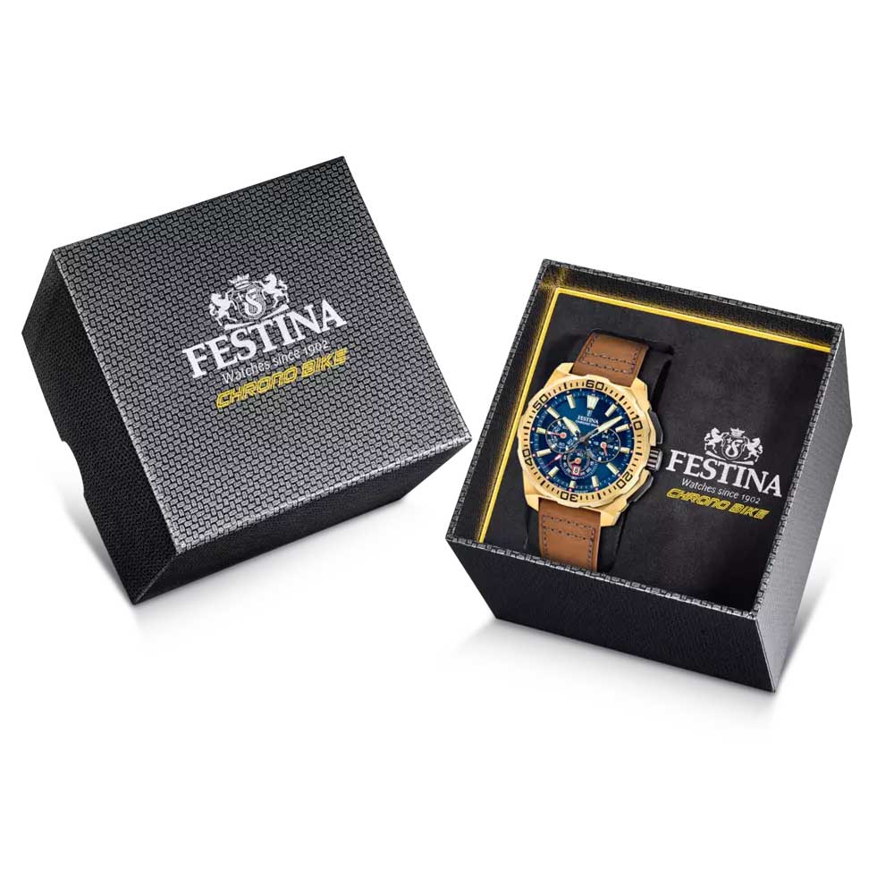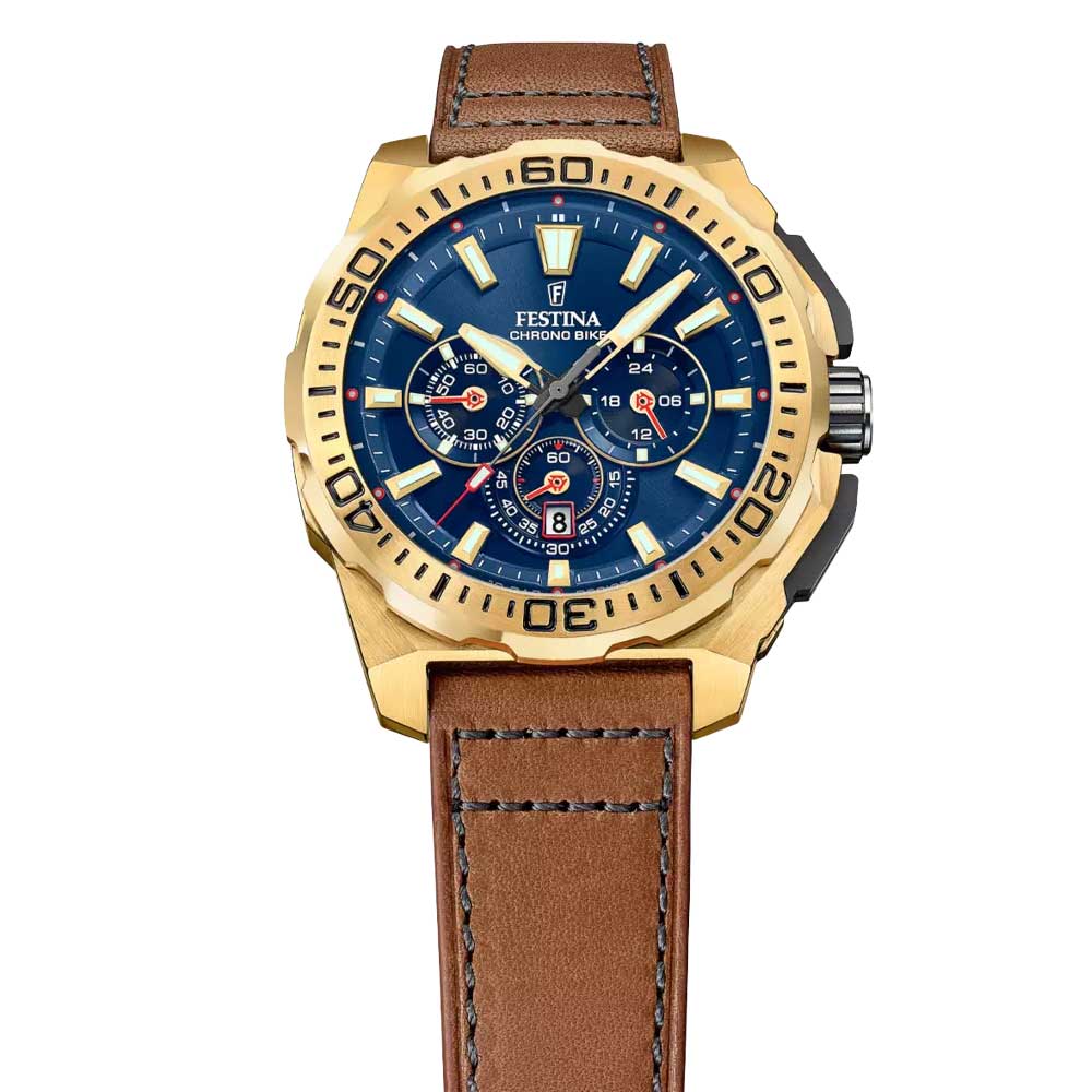CHRONO BIKE F20728/1The Festina Chrono Bike 2025 is the perfect combination of sportiness and elegance, designed for those who seek precision and style in one piece. Its 45.5 mm stainless steel case ensures strength and durability, while its leather strap adds a sophisticated touch and a comfortable fit on the wrist. Equipped with a MOS20 quartz movement, this chronograph offers precise timekeeping and features a date window at 6 o'clock for added functionality. Its dial, with vibrantly coloured details, applied indexes and luminescent hands, ensures excellent legibility in any lighting conditions.