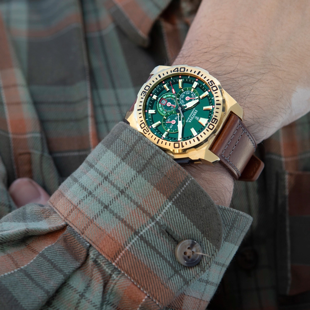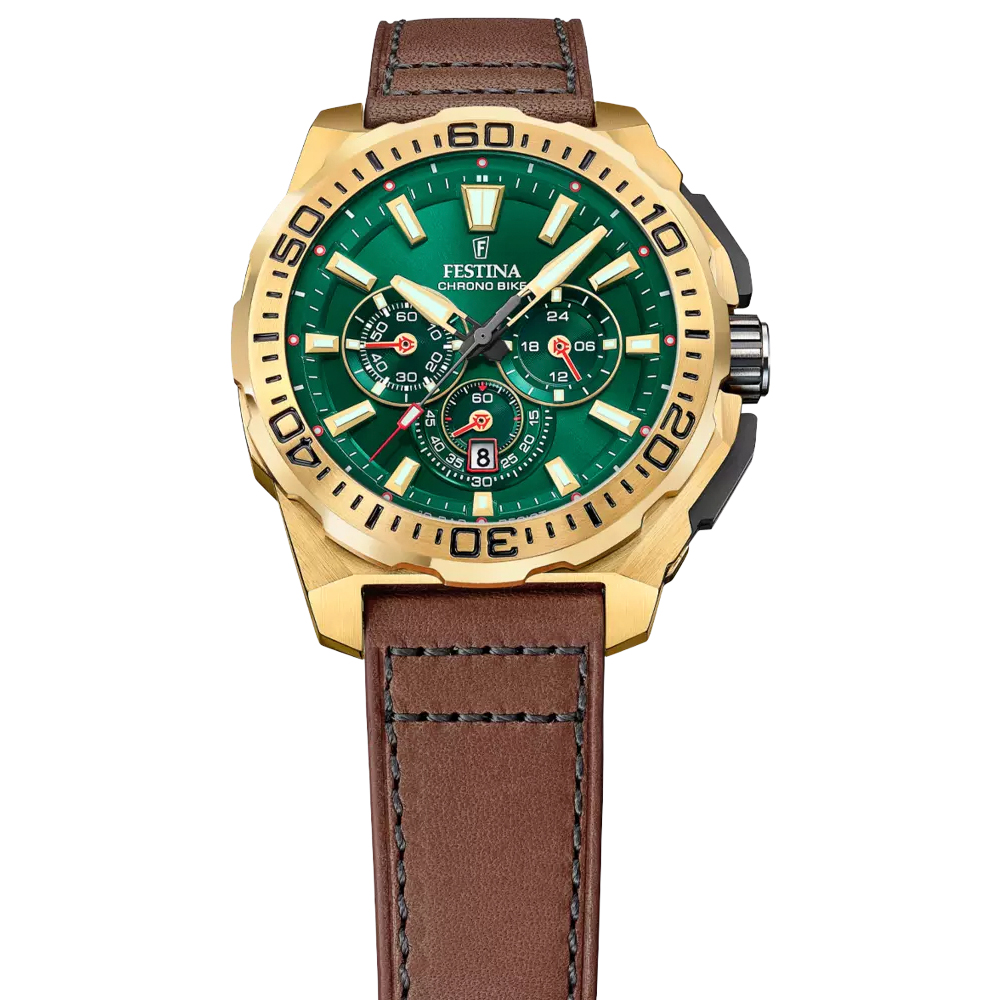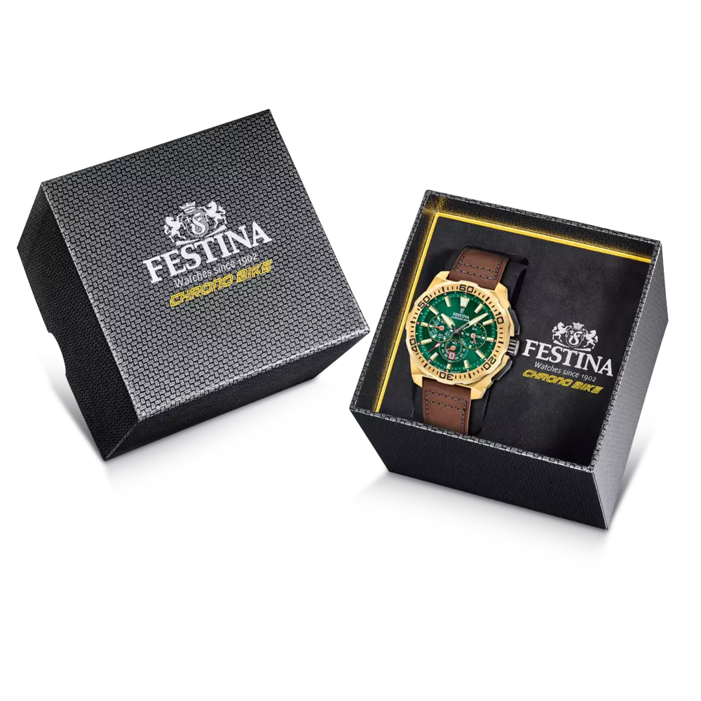 CHRONO BIKE F20728/2The Festina Chrono Bike 2025 is the perfect combination of sportiness and elegance, designed for those who seek precision and style in one piece. Its 45.5 mm 316L stainless steel case with gold PVD ensures sophisticated strength and durability, while its leather strap adds a sophisticated touch and a comfortable fit on the wrist. Equipped with a MOS20 quartz movement, this chronograph offers precise timekeeping and features a date window at 6 o'clock for added functionality. Its dial, with vibrantly coloured details, applied indexes and luminescent hands, ensures excellent legibility in any lighting conditions.