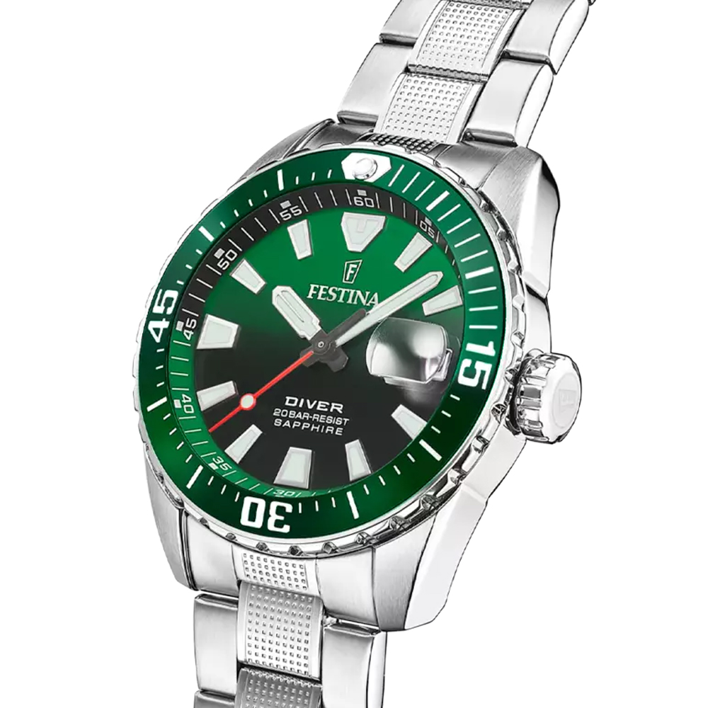 Shop now URL https://www.timewatches.co.za/products/festina-the-originals-quartz-green-dial-fluorescent-steel-indices-stainless-steel-mens-watch-f20669-2