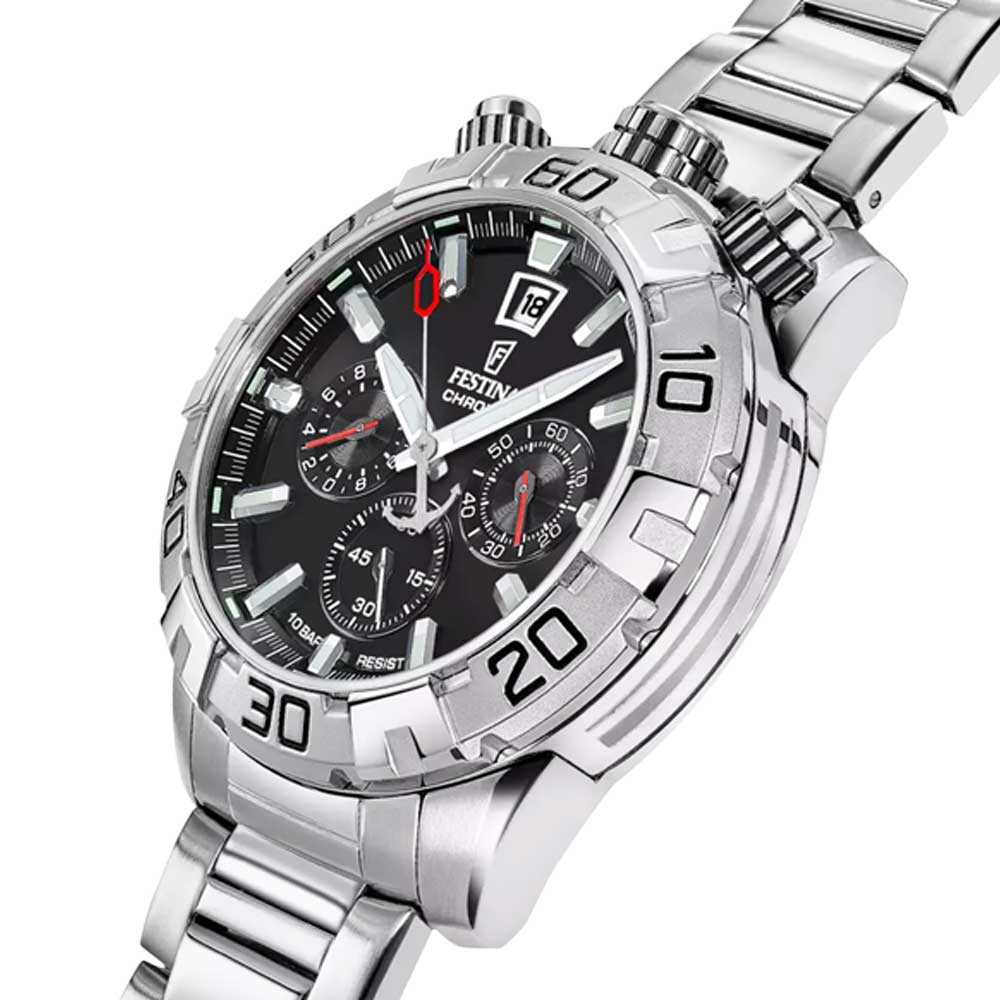 THE ORIGINALS F20743/6The Festina Bullhead F20743/6 stands out with its black dial and 45 mm case that blend strength with timeless style. Equipped with a plated stainless steel bracelet, it offers a refined and distinguished finish. Its Bullhead configuration, with pushers located at the top, gives this watch a unique personality in the world of timepieces.