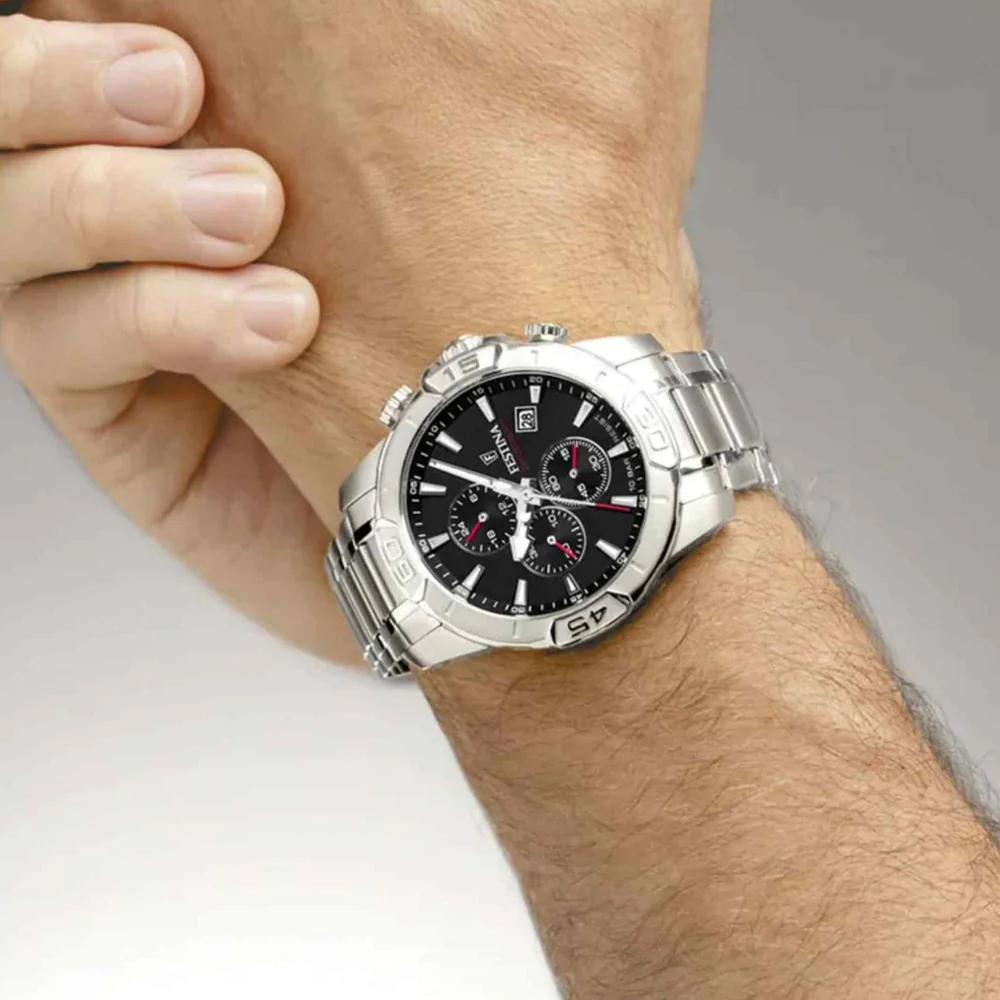 Shop now URL https://www.timewatches.co.za/products/festina-timeless-chronograph-black-dial-stainless-steel-mens-watch-f20704-3