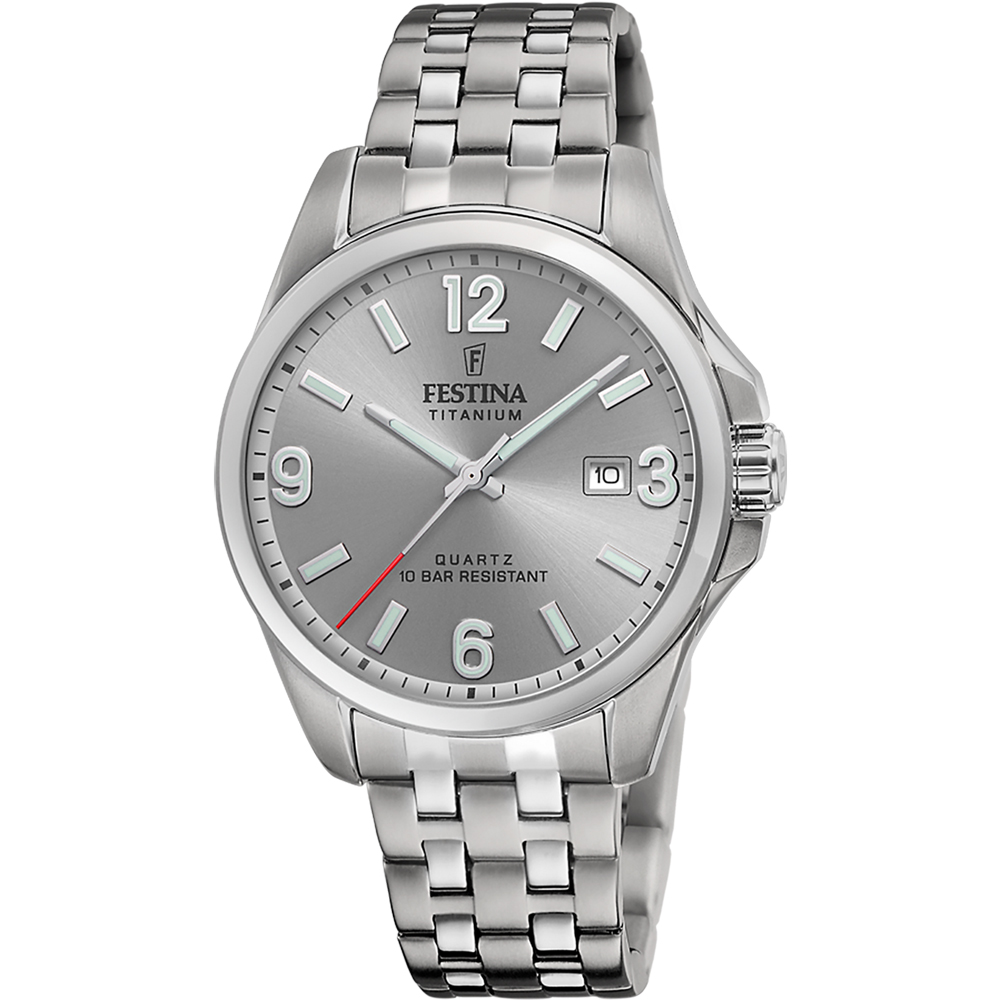 TITANIUM F20698/1The Festina Titanium watches are a true work of art. This gents 43mm silver dial features a black bezel and titanium case and bracelet and has a mineral glass. Water resistant to 100 meters.This watch is a testament to the highest quality and sophistication. Additionally, its titanium bracelet makes it a durable and a resistant accessory.